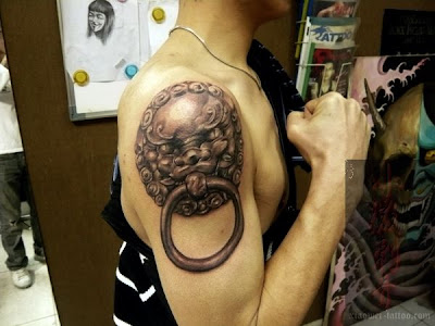 This free tattoo design is a door knocker, which is an item of door furniture that allows people outside a house to alert those inside to their presence. A door knocker has a part fixed to the door, and a part (usually metal) attached to it by a hinge that may be lifted and used to strike a plate fitted to the door, or the door itself, making a noise. The struck plate, if present, would be supplied and fitted with the knocker. Such as this one.